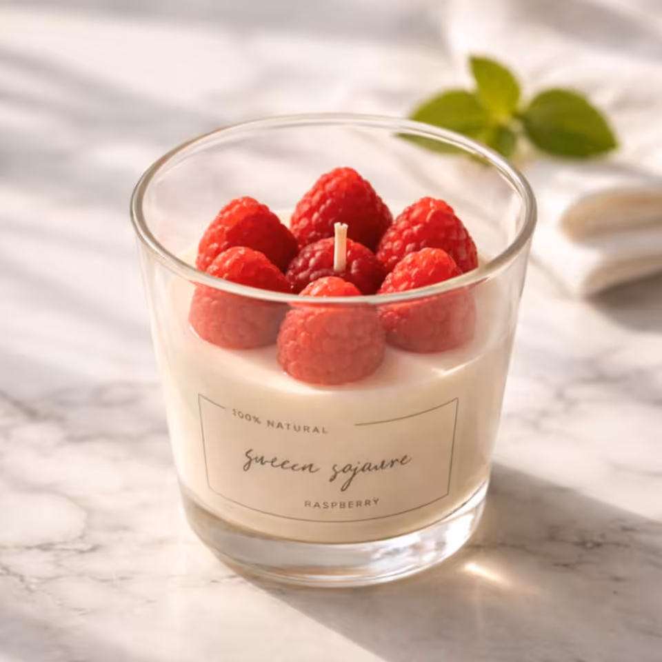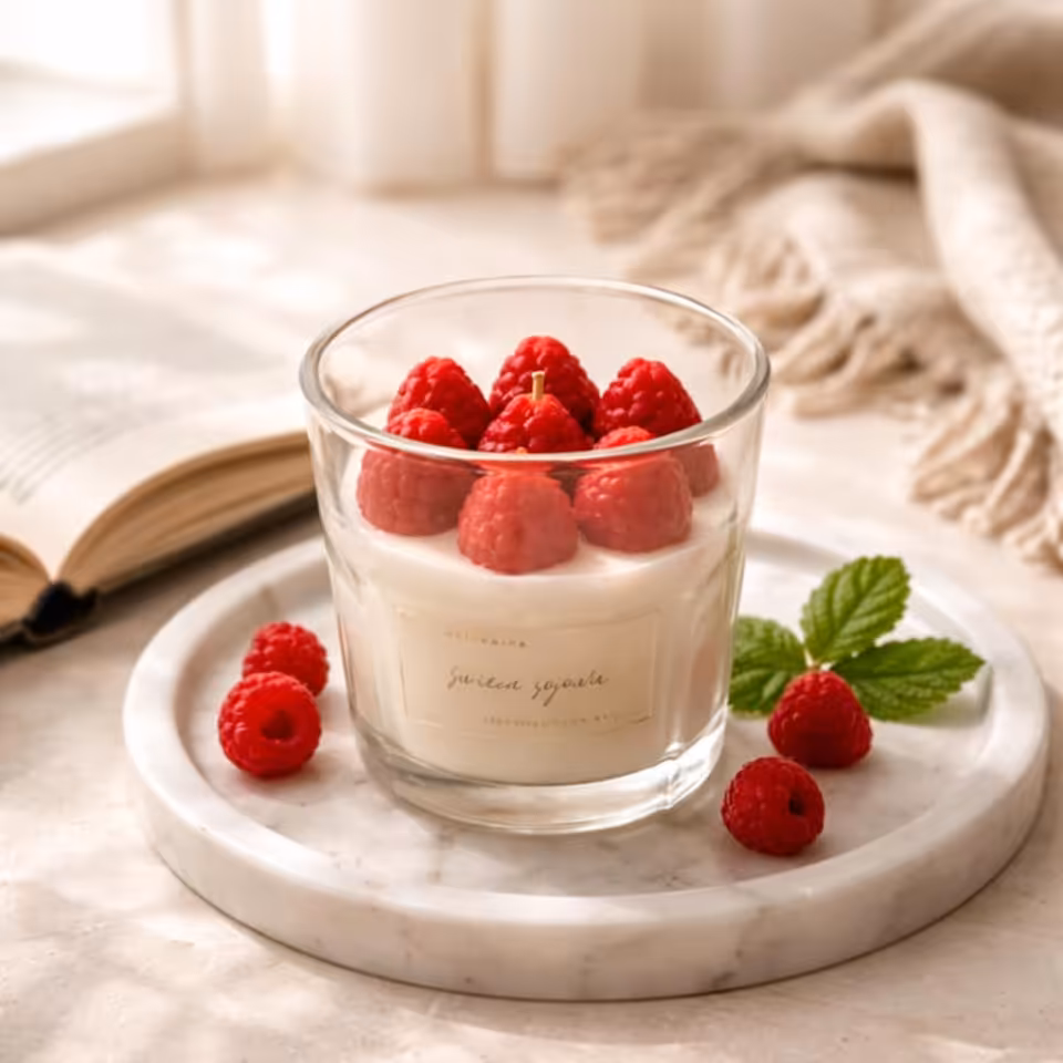 Świeca sojowa Soczysta Malina to naturalna świeca zapachowa o intensywnym, owocowym aromacie dojrzałych malin. Wykonana z ekologicznego wosku sojowego, zachwyca nie tylko zapachem, ale także wyjątkowym wyglądem – realistyczne, dekoracyjne maliny na wierzchu sprawiają, że świeca prezentuje się jak prawdziwy deser.